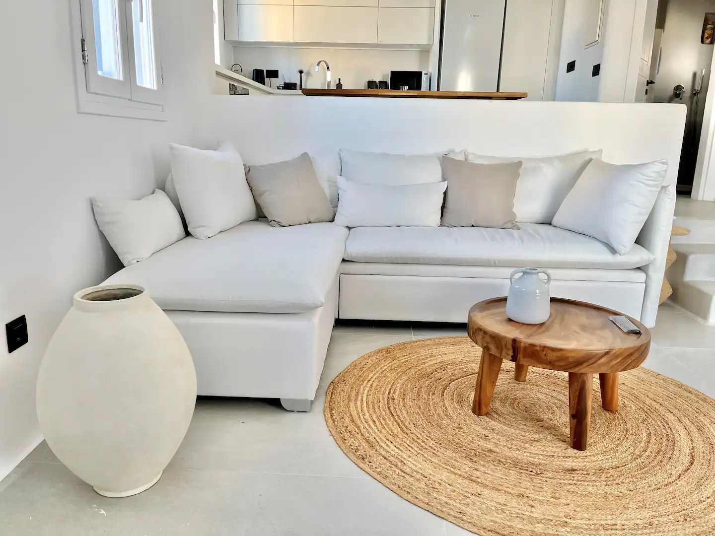 Η βεράντα διαθέτει χτιστό καναπέ και γωνιακό τραπέζι με θέα στους δύο παλιούς μύλους, το χωριό Άνω Μερά και το μοναστήρι της Παναγίας Τουρλιανής. Εδώ μπορείτε επίσης να δείτε τα φανταστικά ηλιοβασιλέματα της Μυκόνου. Η κύρια κουζίνα είναι πλήρως εξοπλισμένη με πλυντήριο πιάτων και πλυντήριο ρούχων. Υπάρχουν τρία παραδοσιακά μπάνια, ένα στο κύριο υπνοδωμάτιο, το δεύτερο δίπλα στο δεύτερο υπνοδωμάτιο και το άλλο στο χώρο του καθιστικού. Το διαμέρισμα AJA Mills διαθέτει επίσης ιδιωτικό χώρο στάθμευσης ακριβώς μπροστά από την κύρια είσοδο του σπιτιού.